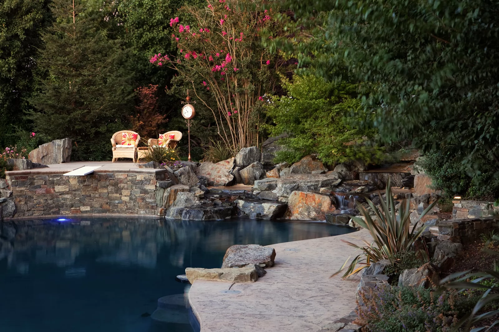 The client wanted a completely natural pool and garden environment which looked and functioned like a mountain swimming hole. We chose all natural finish materials such as stone, boulders, and pebble plaster for the pool, spa and water feature.