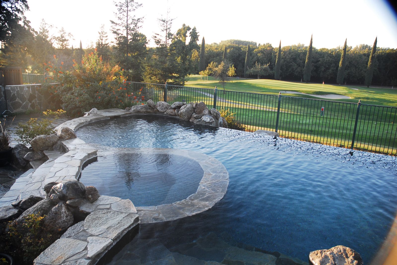This beautiful golf course backyard features a 50’ swim lane, natural waterfall, infinity edge and natural materials. The pool was raised 18” above grade to provide privacy and the infinity viewpoint.