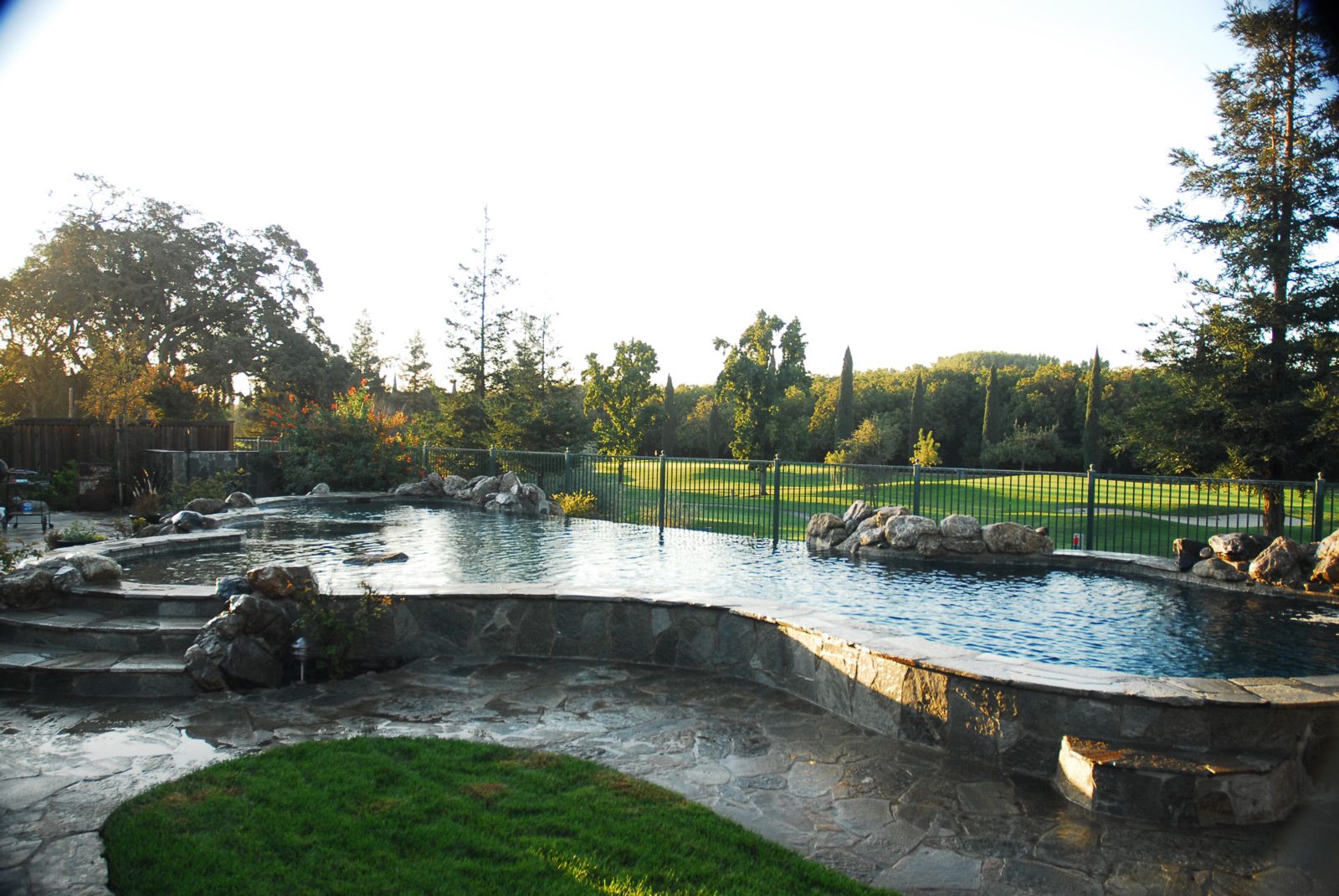 The client wanted a completely natural pool and garden environment which looked and functioned like a mountain swimming hole. We chose all natural finish materials such as stone, boulders, and pebble plaster for the pool, spa and water feature.