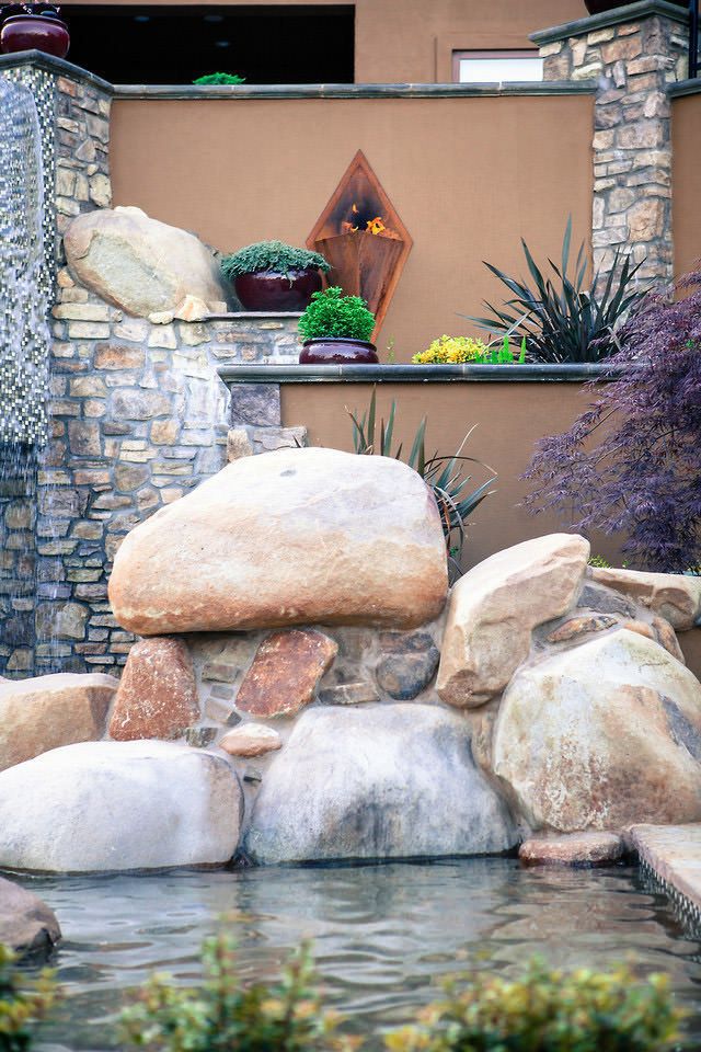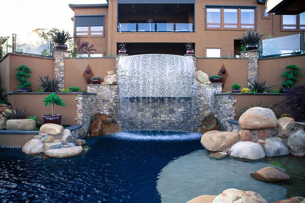 The client wanted a completely natural pool and garden environment which looked and functioned like a mountain swimming hole. We chose all natural finish materials such as stone, boulders, and pebble plaster for the pool, spa and water feature.