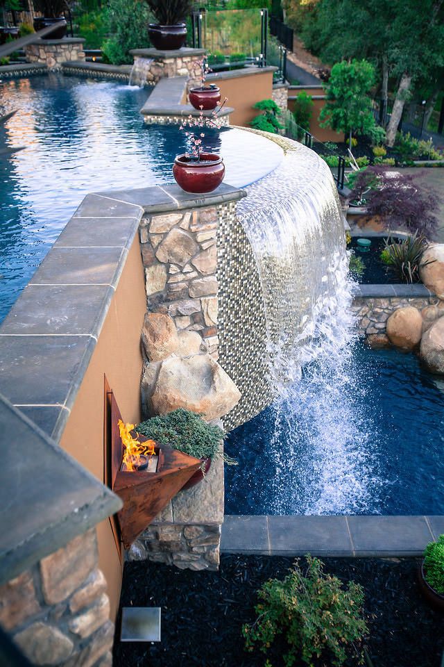 This beautiful golf course backyard features a 50’ swim lane, natural waterfall, infinity edge and natural materials. The pool was raised 18” above grade to provide privacy and the infinity viewpoint.