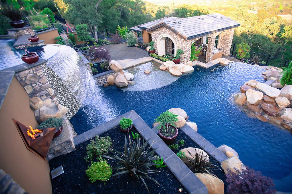 Reminiscent of a five-star hotel, this project has all there is to offer in the way of first-class architecture and resort features. Two pools, a spa, and a pool house are perched on a 45 degree downward sloping hill. The design includes an upper pool with traditional curvilinear lines and sits 15’ above the natural, free flowing pool below. The upper pools’ infinity edge and floor and wall sections cantilever 11’ over the pool below creating a grotto style space under the upper pool. A swim up bar, full outdoor kitchen and bar, bathroom and veranda are features of the outdoor living room/open air pool house.