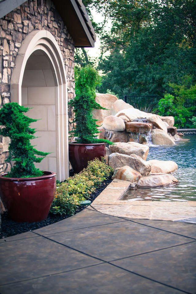 The pool has a Natural Style design with resort living in mind. The design incorporates a water feature, swim in grotto, fire pit, and attached pavilion with cook center.