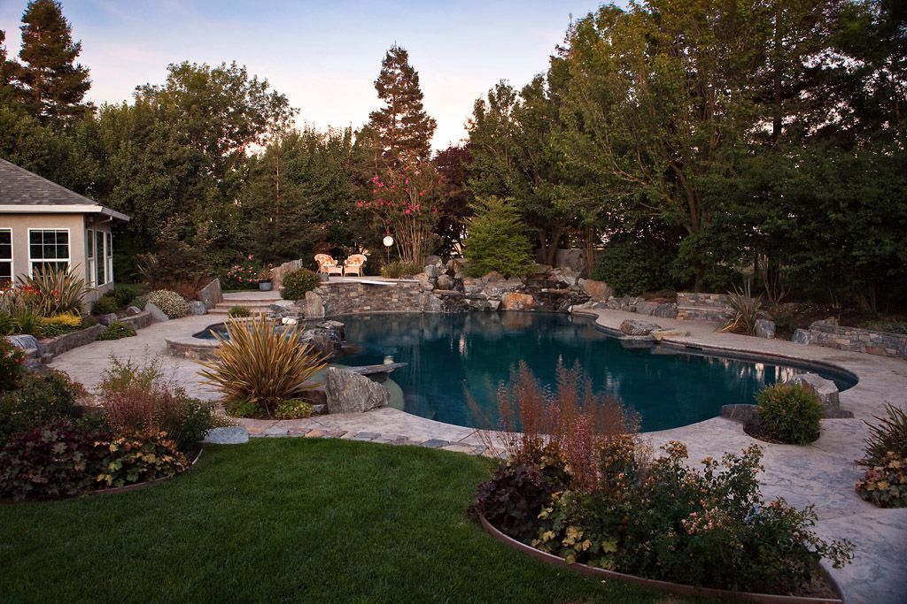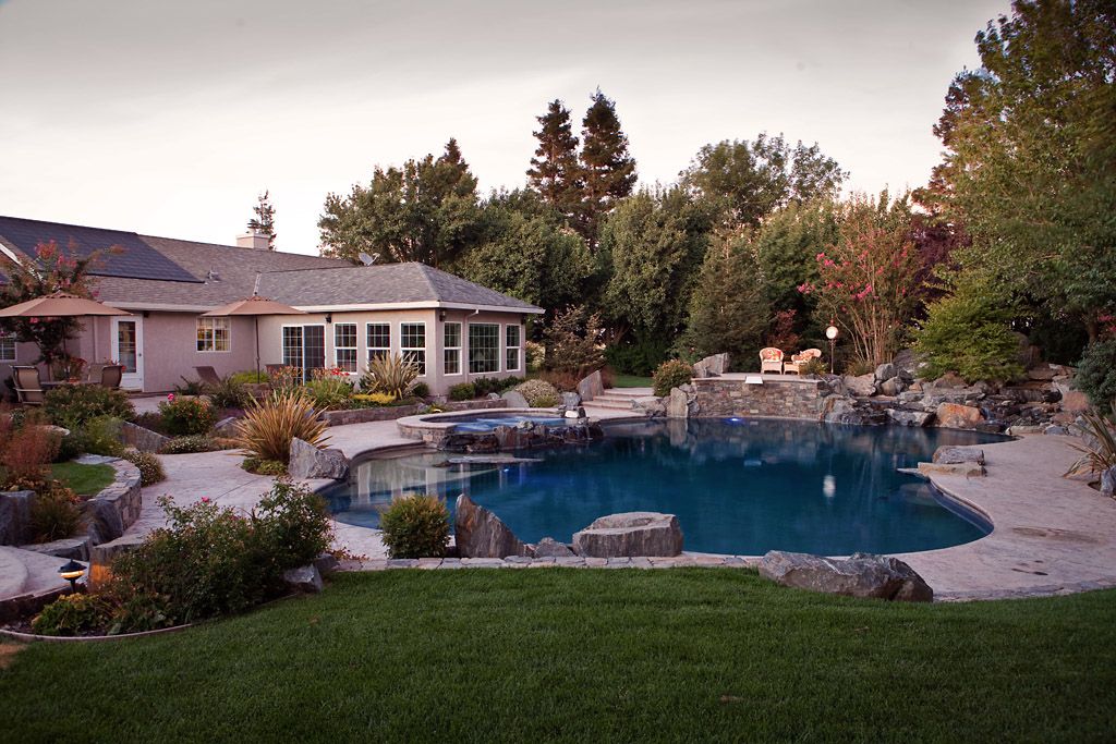 The client wanted a completely natural pool and garden environment which looked and functioned like a mountain swimming hole. We chose all natural finish materials such as stone, boulders, and pebble plaster for the pool, spa and water feature.